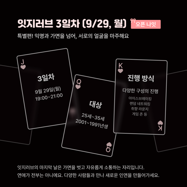 - ์ผ์ : 9/30(์) 19:00~21:00 (2์๊ฐ) (1๋ถ/2๋ถ ๊ตฌ์ฑ X)