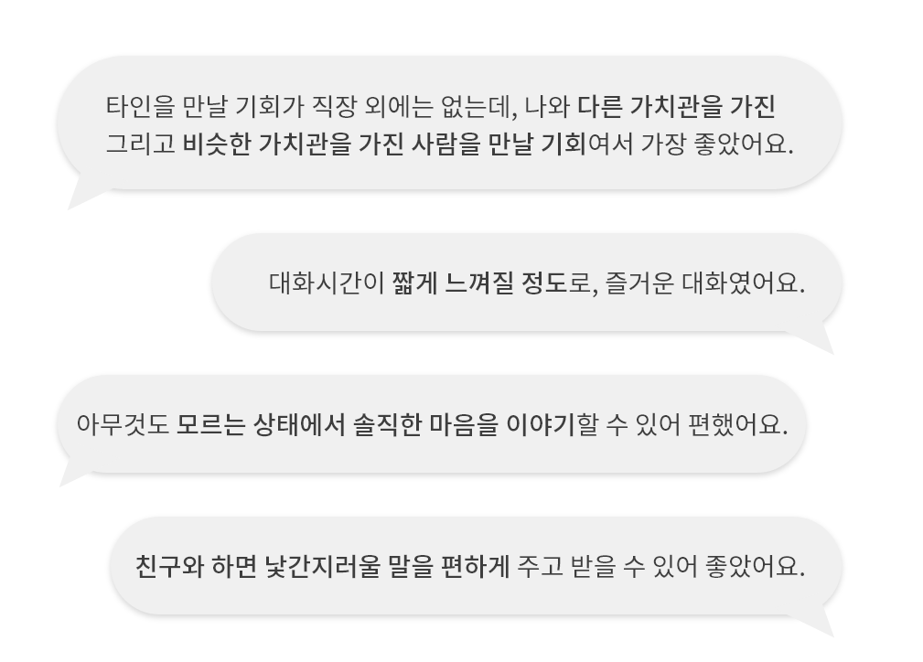 ๋์ ์๋๋ฐฉ์ ์๊ฐ๊ณผ ๊ฐ์ ์ ๋ถ๋ด ์์ด ํธํ๊ฒ ์ด์ผ๊ธฐํ๋ ์๊ฐ, ํจ๊ปํ์ค๋์?